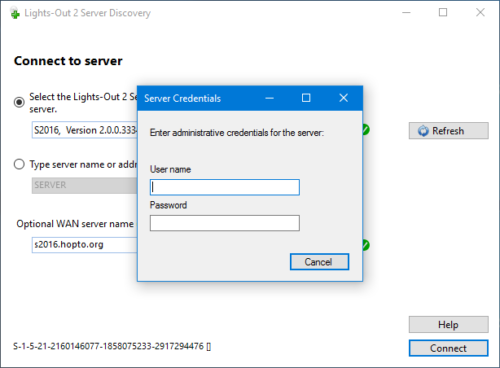 If you run your server with a Microsoft Account, you should use the mapped short user name here. To see the mapped name, open Lights-Out Console, Settings, Users. If you connect to a server with Active Directory, you may have to use the format DOMAIN\admin as user name.